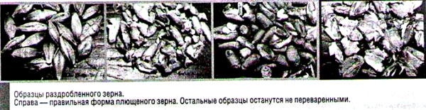 В других хозяйствах для плющения использовали зерно с влажностью 24% и менее, при этом мелкие зерна проходили целыми, а часть зерен дробилась на гранулы, не образуя плющеную форму (фото). Такое зерно, как правило, плохо трамбуется с повышением риска нагревания и плесневения корма. В процессе пищеварения часть зерна остается непереваренной, а зерно, измельченное до мелких фракций, быстро проходит преджелудки. Такой корм снижает кислотность рубца, ухудшает усвояемость клетчатки и других питательных веществ всех кормов рациона.