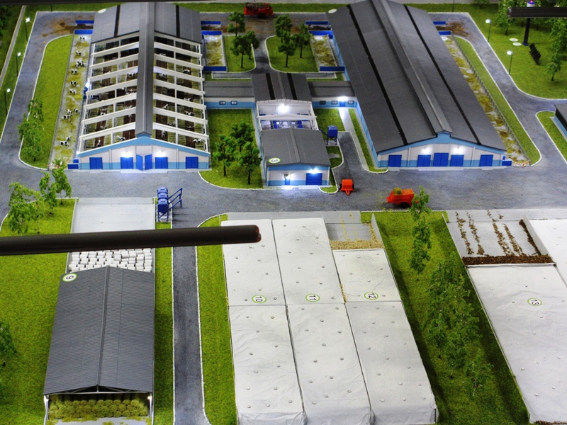 The model of milking parlor Parallel Swing-over of UNIBOX based on technology of DairyMaster; foam generator for washing milking parlors; and detailed model of farm for 600 animals from light concrete construction of JV BetonBox Ltd were demonstrated in the open exhibition hall.