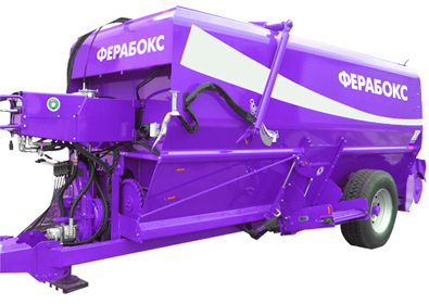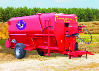 Fodder mixer distributor «KRG-11 (13, 15, 17)» is designed for animal barns and for open sites close to the barns. Grinding and mixing may be disconnected during movement of loaded machined from loading and mixing site to dispensers and may be easily connected at the right moment without jamming of conveyors with forage and overloading of power shaft of the tractor.